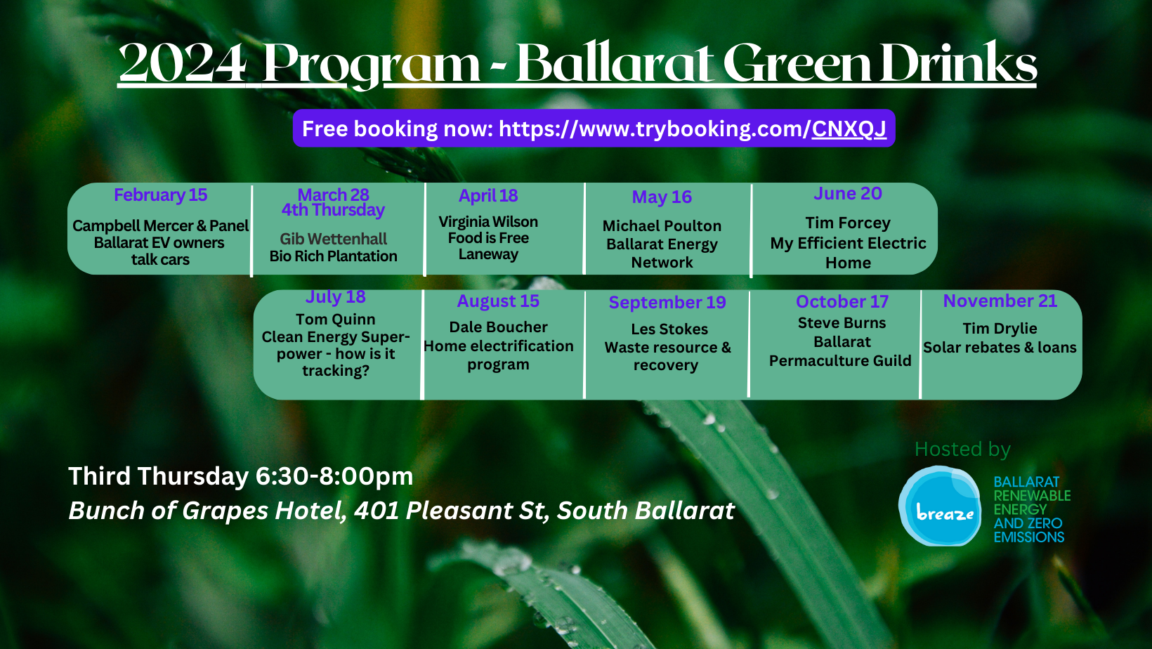 Tom Quinn, Former Head of Policy at Beyond Zero Emissions spoke at Green Drinks last year about the project he was leading involving unions and the corporate sector to lobby the Albanese government to invest in renewable energy on a scale similar to the US investment policy – the Inflation Reduction Act (IRA). This year Tom has agreed to return and tell us how the ambitions of the group panned out. Another not to be missed Green Drinks event. This was a very popular talk last year so do please book your free ticket via our Trybooking site.